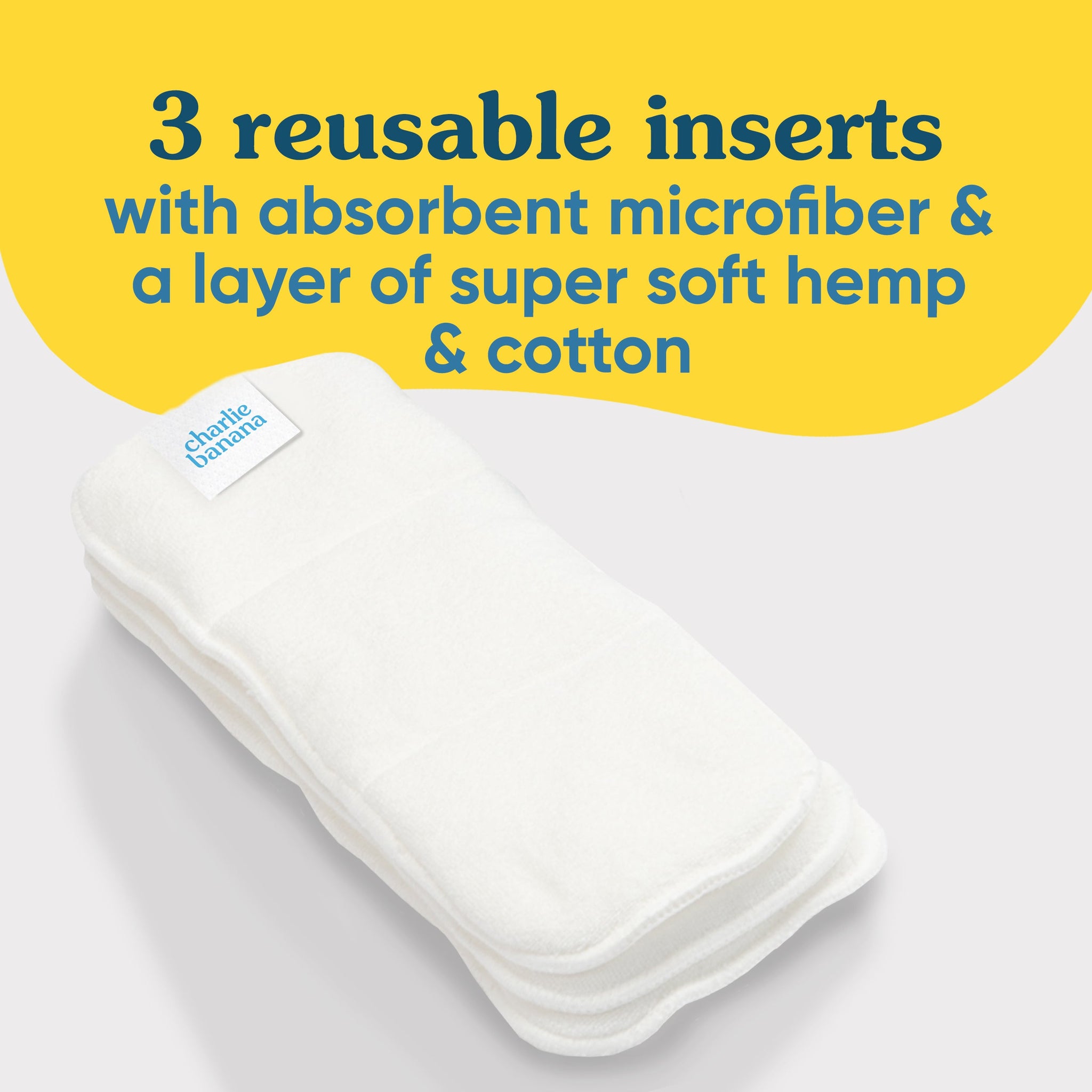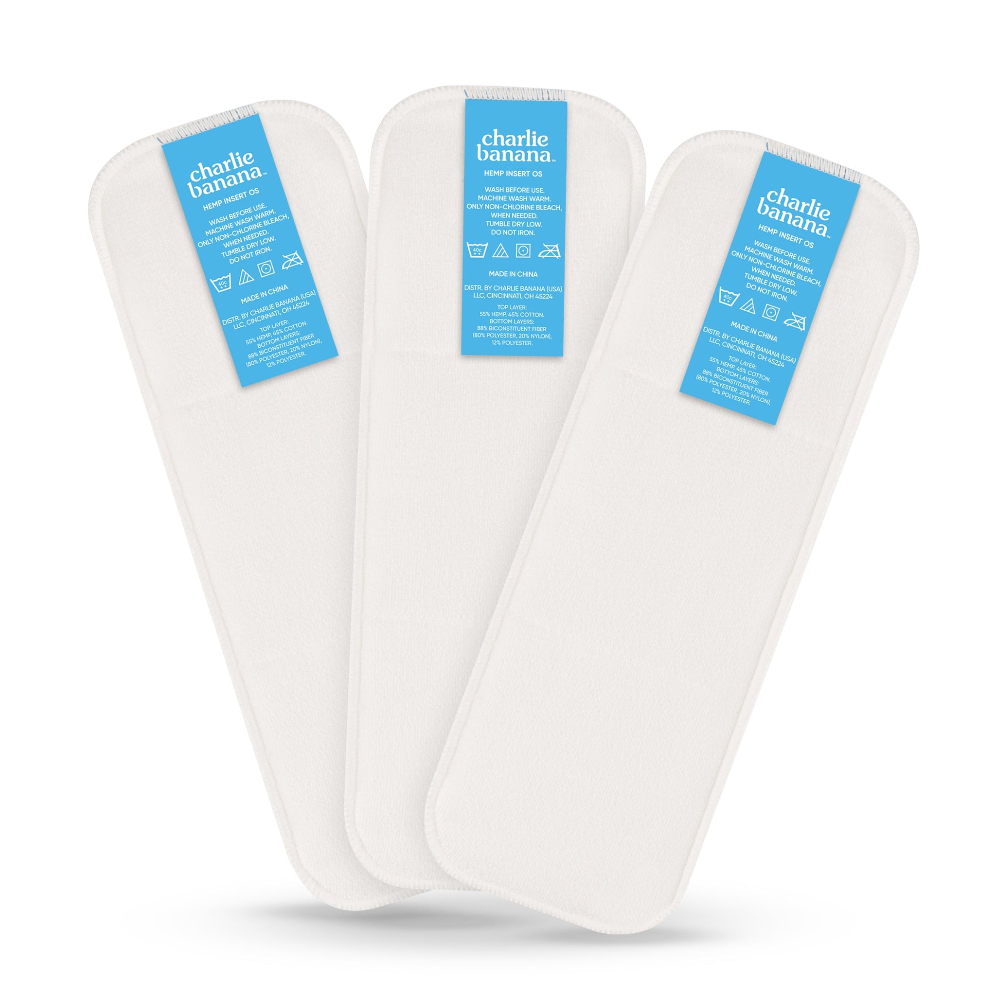 More products...In the box, you'll find three one-size reusable hemp inserts to use in your Charlie Banana diaper. Double up with two inserts for extra protection or pair with a booster insert for less bulkiness.