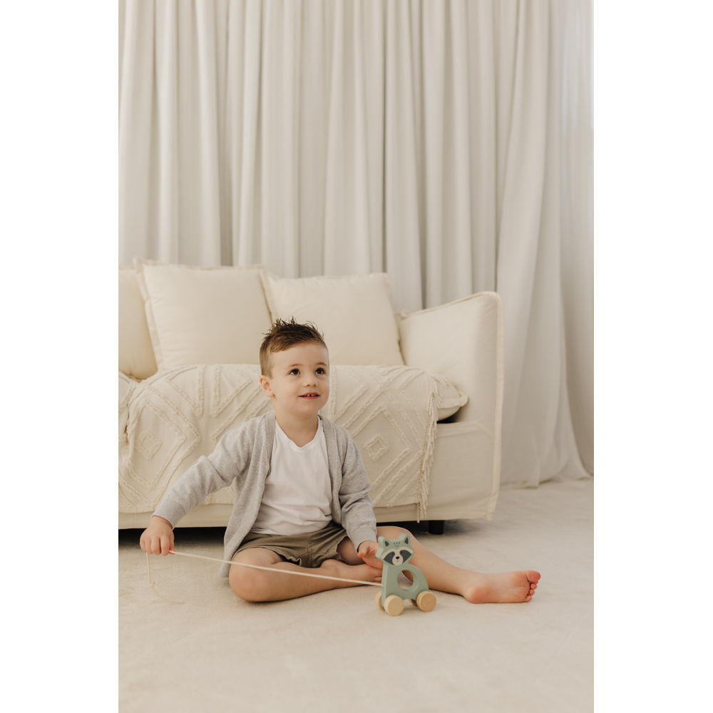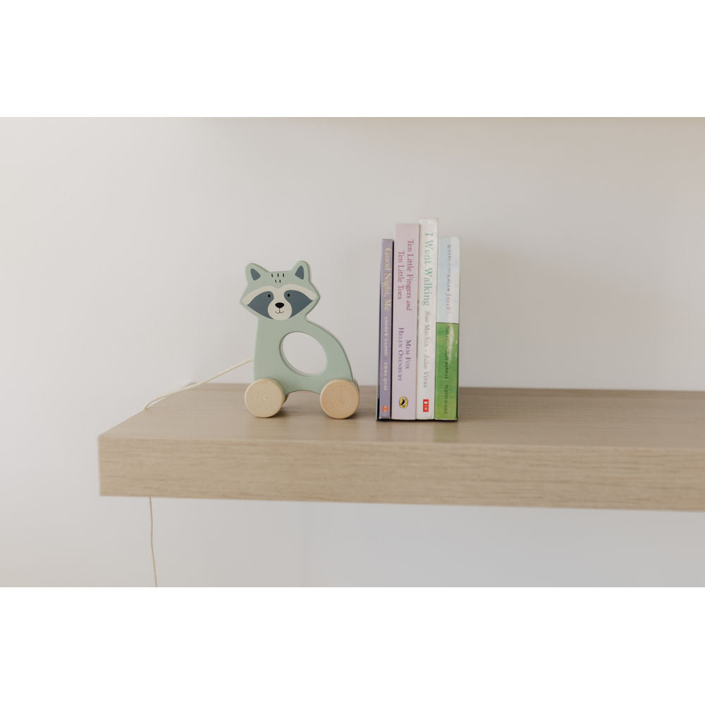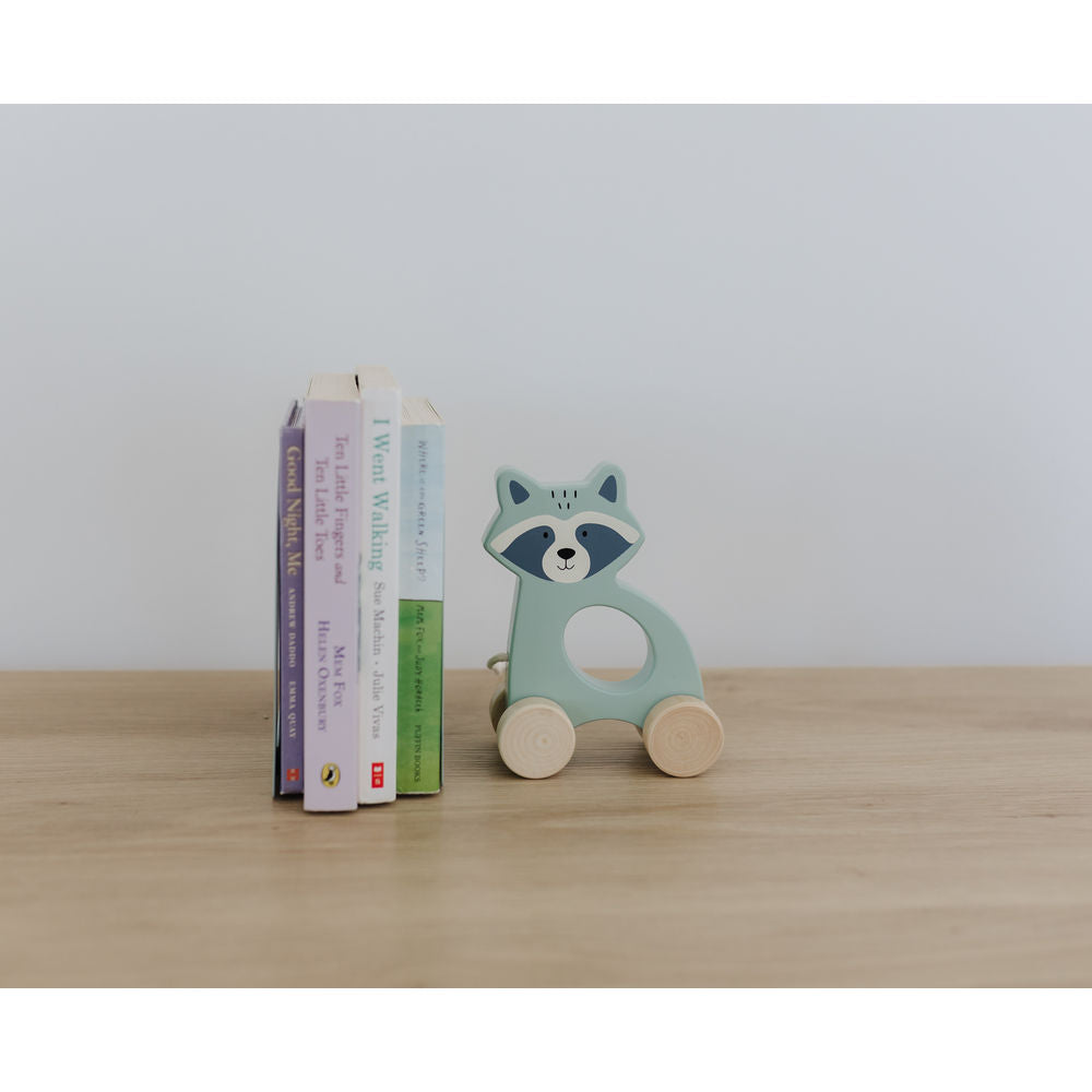 Introducing Bubble's delightful Bubble Raccoon Wooden Pull Along Toy - a charming green, pull-along toy embodying timeless simplicity. This timeless treasure is designed to capture the hearts of both children and parents alike.
